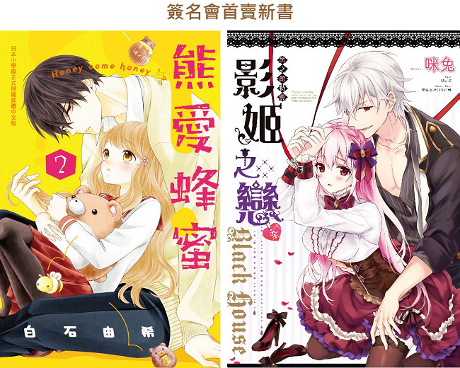 高雄动漫节作者签名会首卖书《熊爱蜂蜜Honey come honey》:长相娇弱却是超强武力派vs外表凶恶却喜欢可爱东西,白石由希为你献上最甜蜜的反差萌恋爱故事!人气原创小说《黑之馆特典:影姬之恋》:鬼姬与影的CP特典外传!内容将添加不同于以往的挑逗剧?情?,更是第一本限制级的黑之馆!