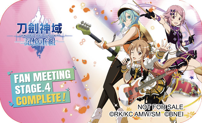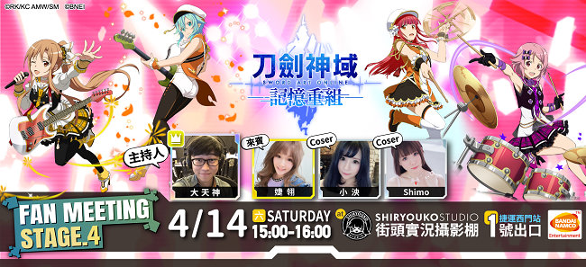 继今年1月举行的《刀剑神域-记忆重组-》发行1周年纪念粉丝见面会,决定再次于4月14日在台北市内举行「FAN MEETING STAGE.4」。《记忆重组》游戏制作人会在现场亲自发表游戏的最新消息!而且,特别来宾也邀请到「解婕翎」及知名Coser「霜月Shimo」、「小泱」参与本次活动。一起来享受游戏吧!