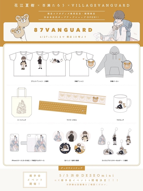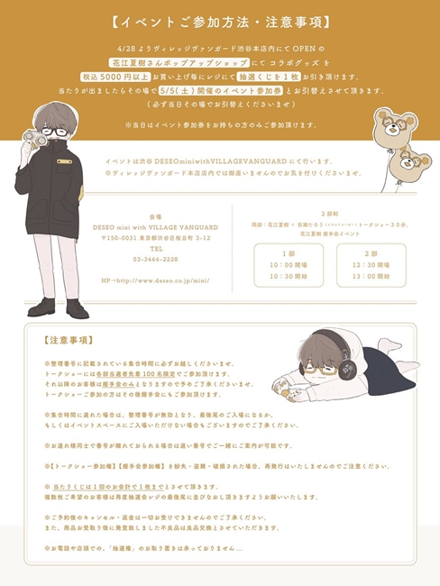 周边将会在4月27日至5月31日于VILLAGE VANGUARD涩谷本店设置快闪店,即将内购买满5000圆还可获得一张抽选券能参加谈话与握手会的抽选,活动则是在5月5日于涩谷DESEOminiwithVILLAGEVANGUARD举办,共有2场。有机会去逛逛的粉丝顺便带几个花江夏树(?)回家吧!