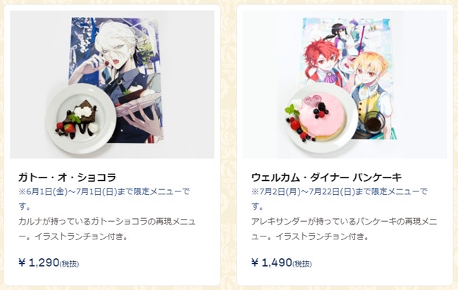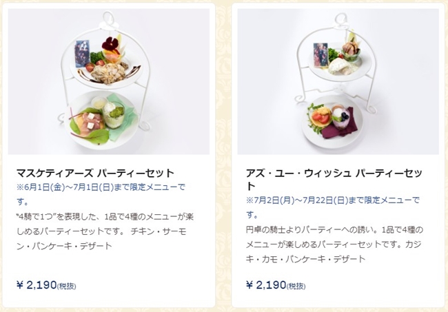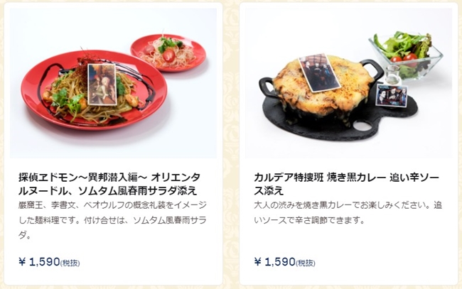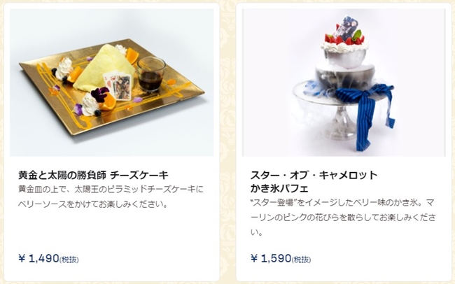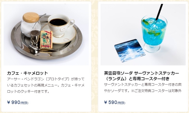 主餐、甜点和饮品都分别有4种选择,其中「マスケティアーズ」、「アズ?ユー?ウィッシュ」、「ガトー?オ?ショコラ」以及「ウェルカム?ダイナー」为期间限定的餐点,若想吃吃看可得确定好有提供的时间唷!另外「ガトー?オ?ショコラ」和「ウェルカム?ダイナー」将附有一张餐垫、英灵召唤苏打则会赠送专用杯垫。(有点想要召唤阵的杯垫XDD)
