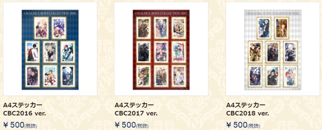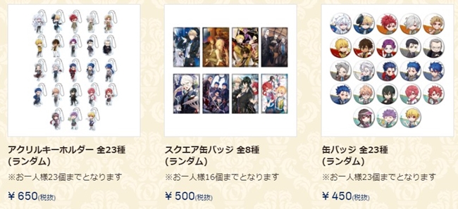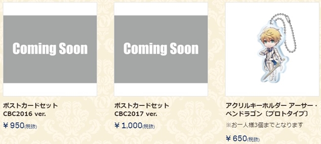 周边商品的部分有Q版的压克力吊饰、圆型徽章、礼装方型徽章、B2大小挂报以及各年分的CBC贴纸组等,值得注意的是还有亚瑟·潘德拉刚〔Prototype〕的灵衣版吊饰。
