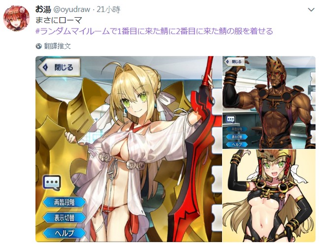 而从昨天开始,在Twitter又刮起了一阵新的F/GO的绘图旋风,原来是有人发起了「#ランダムマイルームで1番目に来た鲭に2番目に来た鲭の服を着せる」这个标签的活动,意思是要玩家们把My room的从者显示设定为随机,然后让第1位出现的从者去穿上第2位从者的服装!要知道这些从者来自东西各方各具特色,确实有人换了衣服后依旧美丽、帅气,但也有人这一换可穿上了超级不得了的打扮,就让我们来看看Twitter上的诸多「绝景(?)」吧~