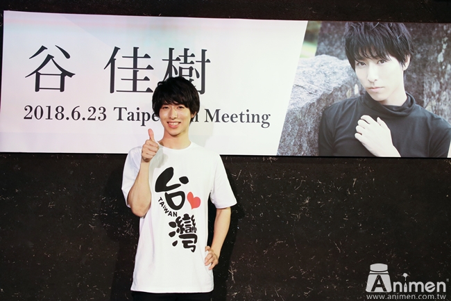 已经是第3次来台的谷佳树,曾与其他《月歌。》舞台剧的成员们一起举办粉丝见面会,并在2018年2月展开公演,这回则是以个人见面会的方式再次来到台湾,不但他本人非常期待,也希望大家能玩得开心,他还特别在前一天买了印有「台湾?」字样的T-shirt,可以感受到他喜爱台湾的心情。