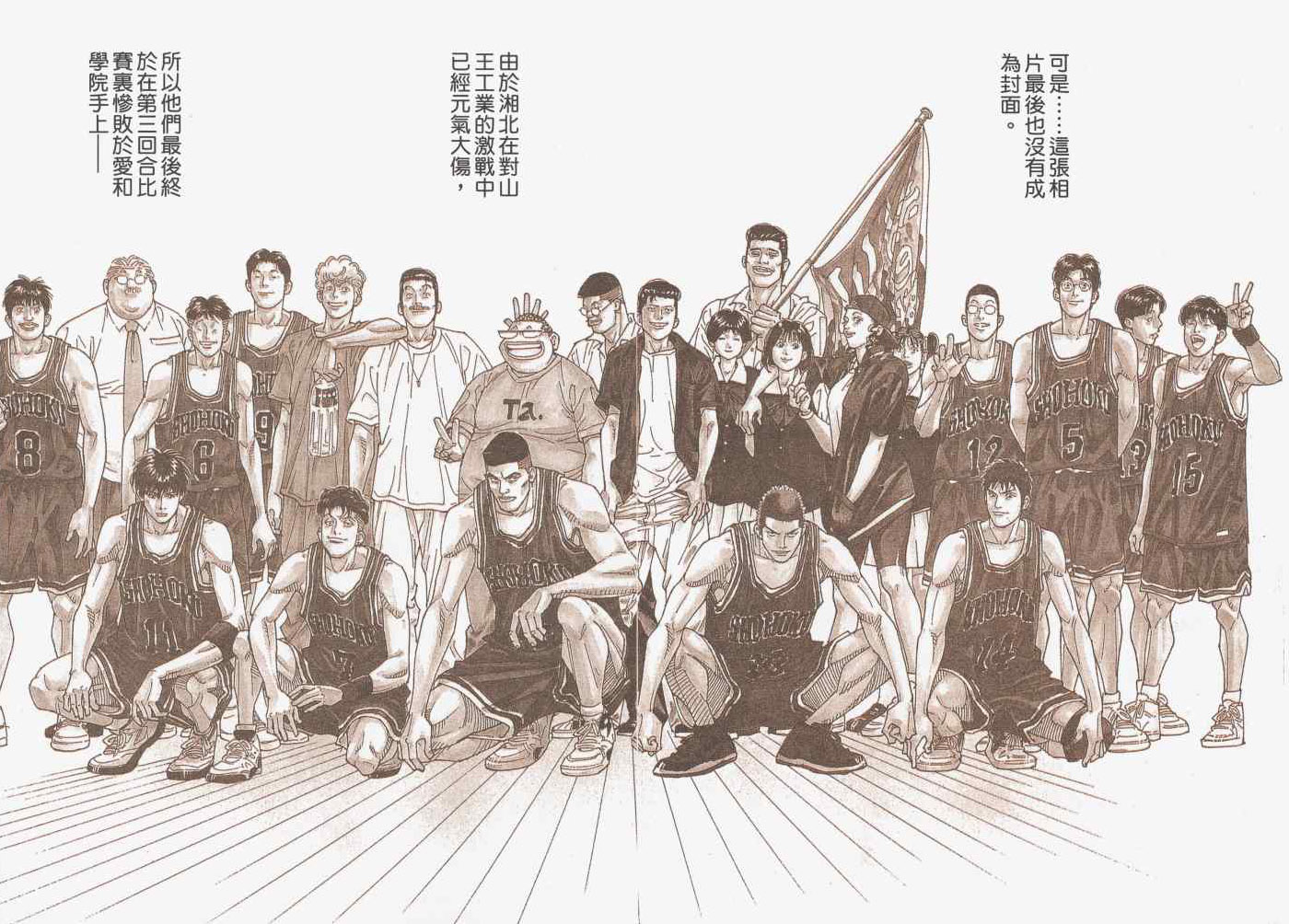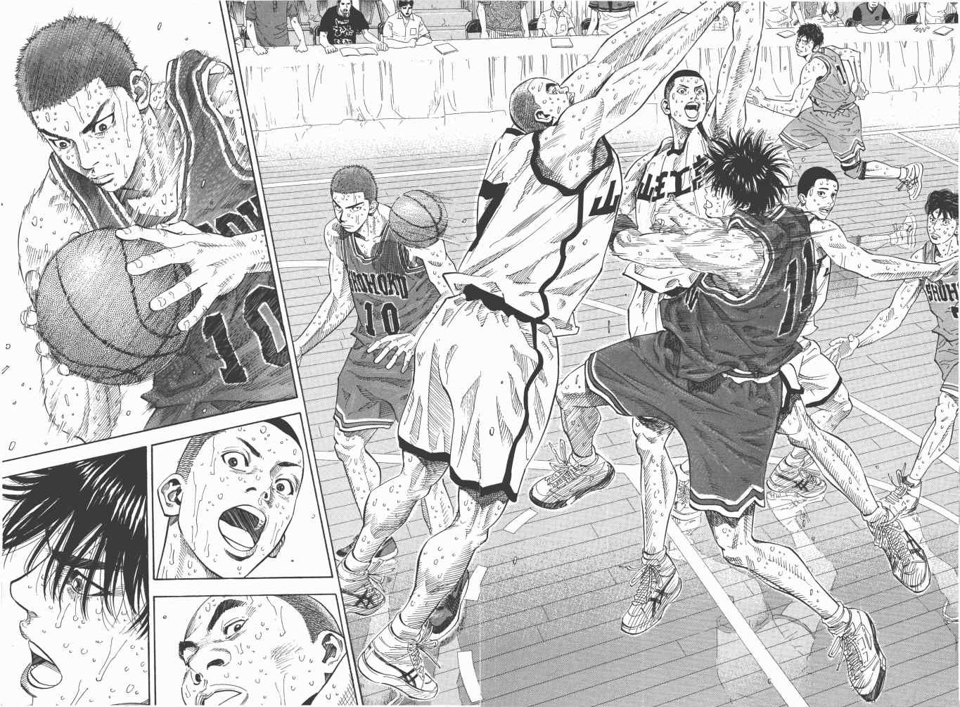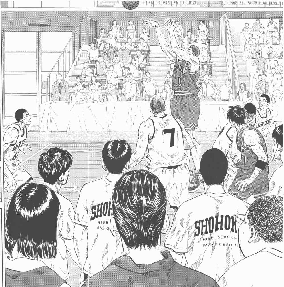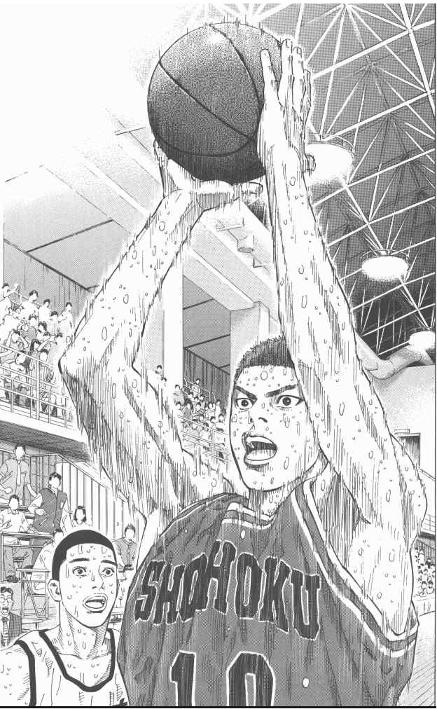 三王战最后2秒樱木花道接到流川枫的传球,射篮一球中的,锁定胜局的经典一球(呵呵,一万多球的成果发挥了作用),话说这球跨越了5页,算是漫画里面时间最长的一球,笔者独家剪切以飨各位。