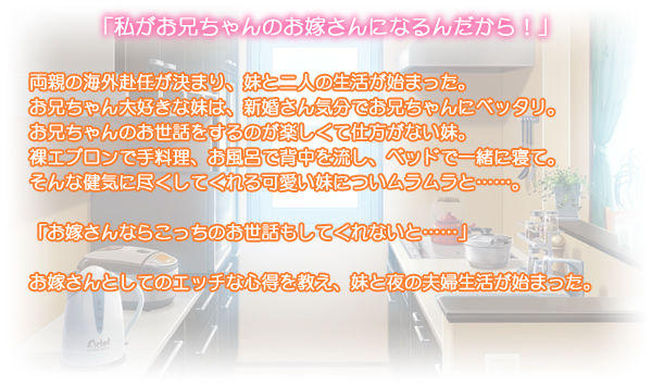禽兽不如的主角趁着父母工作到国外的机会,开始了与妹妹的二人家庭生活。最喜欢哥哥的妹妹,想与哥哥一起体验新婚生活。(果然是各种意义上都很危险的游戏)