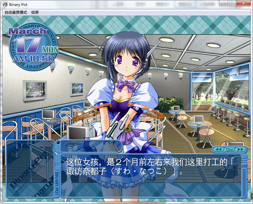 以一个高科技社会为背景,通过现实世界主要场景【网吧咖啡厅binary•pot】与网络虚拟世界【World】的切换,加以各种选项以及移动地点的选择,培养与游戏中女主人公们爱情,最终达到大结局的正统偏SF向AVG。